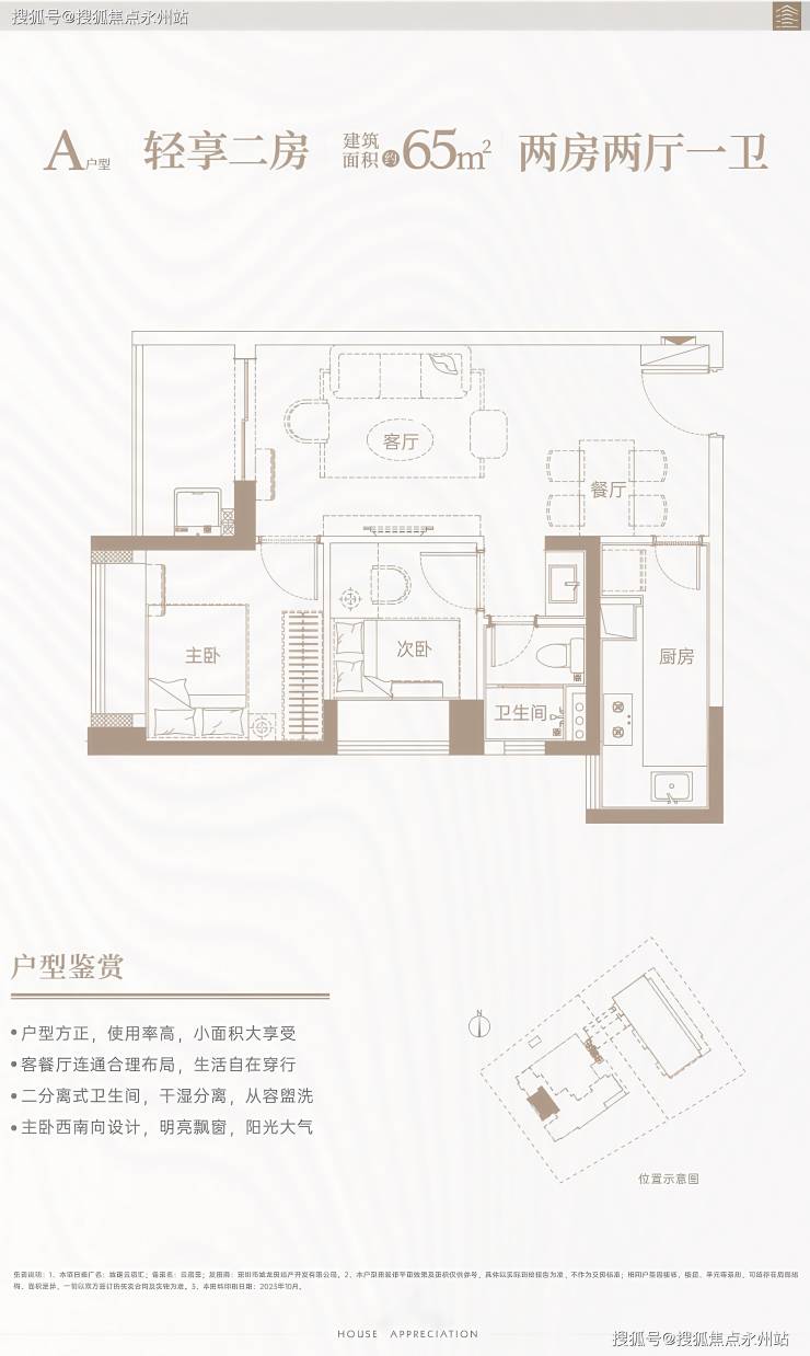 建面约 65㎡ 两房两厅一卫(A 户型)