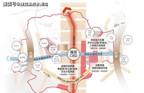 ②两翼: “金融时尚西翼”(香蜜湖新金融中心、车公庙片区和金地—沙头片区)+“科创活力东翼”(环中心公园片区、华强北片区和八卦岭片区)