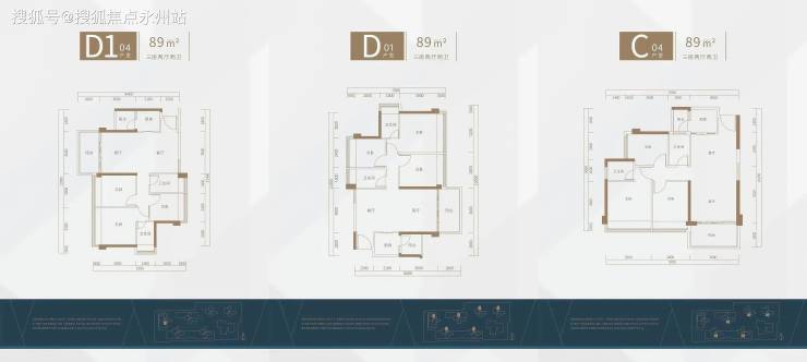C-04、D-01、D1-04均为89㎡3房2厅2卫:D01、D1-04户型朝东向,餐客厅独立,功能分区明显,餐厅有窗户与阳台形成对流,卧室及卫生间均带有采光飘窗,采光通透性好。且客厅开间达到3.6米,空间感阔绰;C04为竖厅布局,也是及比较经典实用的户型。