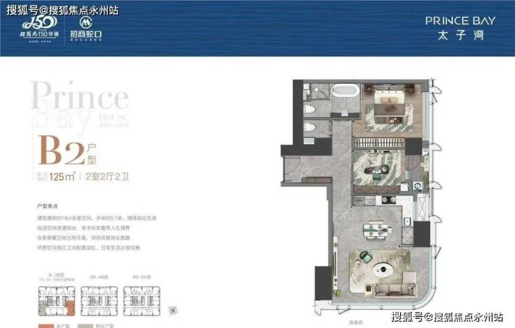 【太子湾•泓玺】总高194米,共1栋,分为顶高低三个区域,低区9-38层4梯8户,面积为88-95-115-125㎡;高区39-48层4梯6户,面积为88-115-226㎡;顶层49-50层4梯4户,面积为216-226㎡,
