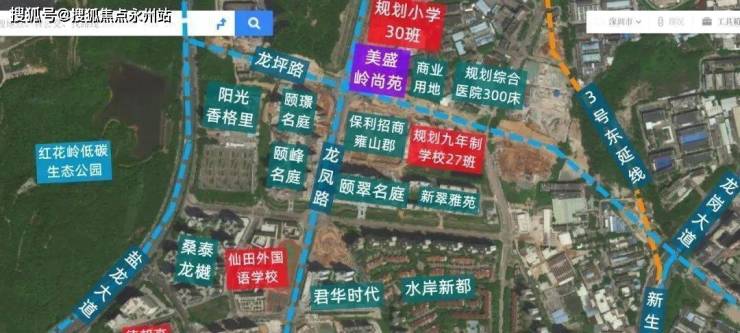 美盛岭尚苑,位于龙岗区龙岗街道龙凤路与龙坪路交汇处,项目所在片区靠近坪地国际低碳城,近年来该片区一座座楼盘拔地而起,改出片区新面貌,造就新生活。项目北侧级东南侧规划有2所学校,1所医院,西侧靠近红花岭低碳生态公园,3号东延线“坪西站”距离约1.1公里,“新生站”距离约1.3公里。