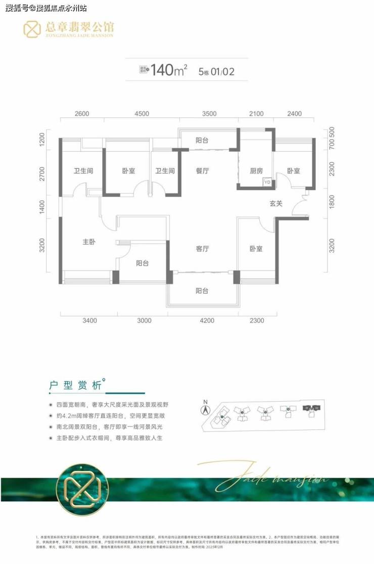 约140㎡五房两卫(5栋01/02户型)四开间朝南,竖厅格局,餐客一体开间4.2米,主卧开间3.4米,卧室1尺寸不明确,卧室2开间2.4米,卧室3开间2.3米,卧室4开间3米,南北双阳台设计,大阳台正南朝向。