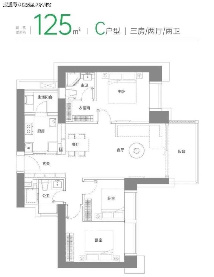 125㎡A(竖厅)三房两卫: