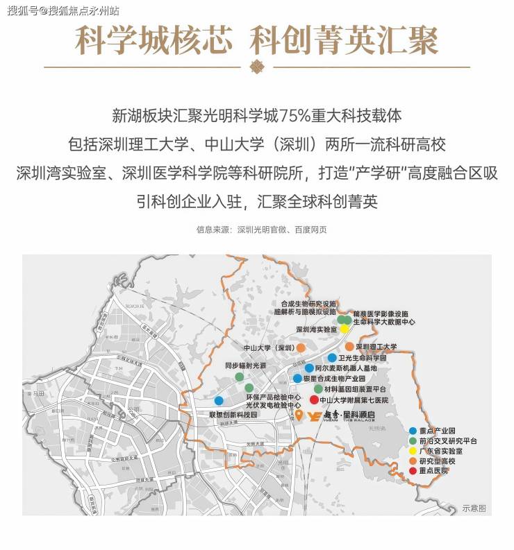 科学城核芯 科创菁英汇聚:新湖板块汇聚光明科学城75%重大科技载体,包括深圳理工大学、中山大学(深圳)两所一流科研高校,深圳湾实验室、深圳医学科学院等科研院所,打造“产学研”高度融合区,吸引科创企业入驻,汇聚全球科创菁英