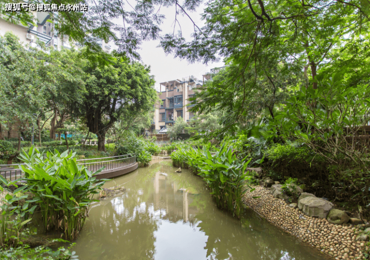 项目内部打造了一条沿着台地蜿蜒的溪流,该水系为市面罕见的活水溪流,贯穿整个社区园林,依据溪岸的曲直不同和地形变化,打造叠水、溪流、瀑布、水潭等多样特色水景,溪岸植物种类繁多,与水流互为风景,沿岸专门设置不同的亲水平台,营造自然灵动的栖心之境。