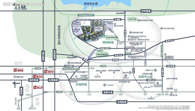 清林新城,作为龙岗区重要“支点”联动“产学研”一体发展,以高端装备制造、生物电子、纳米技术等新兴产业为发展方向,构建“一核、二带、三板块、多节点”的城市总体空间布局,打造绿色智造新城;