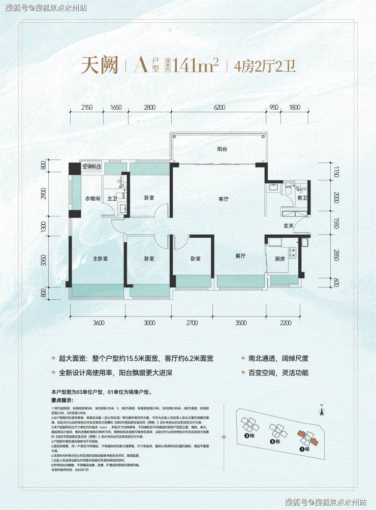 设计亮点:超大面宽,15.5米南向采光面,五大空间朝南。