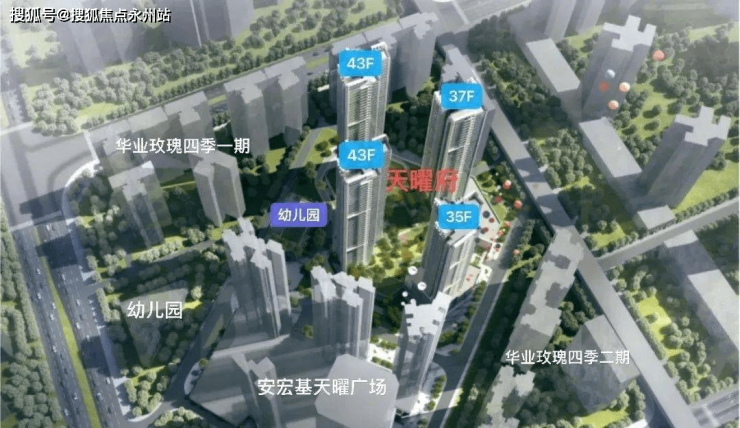 项目地块近似长方形,由4座住宅塔楼和1座幼儿园教学楼组成,其中1栋1-3单元总高35-43层,每层3梯5户;1栋4单元总高37层,每层3梯6户(回迁房都在此座),2栋为3层高的6班幼儿园教学楼。