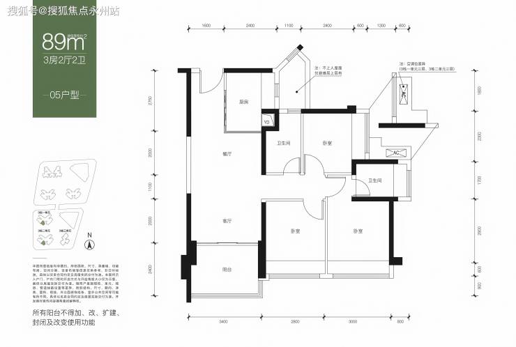 89㎡的3房2厅2卫户型设计的是经典竖厅格局,客厅3.4米开间,三开间朝南,3个卧室分别是3米/2.8米/2.4米的宽度,L型厨房,