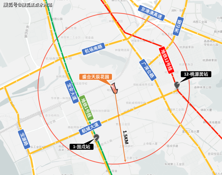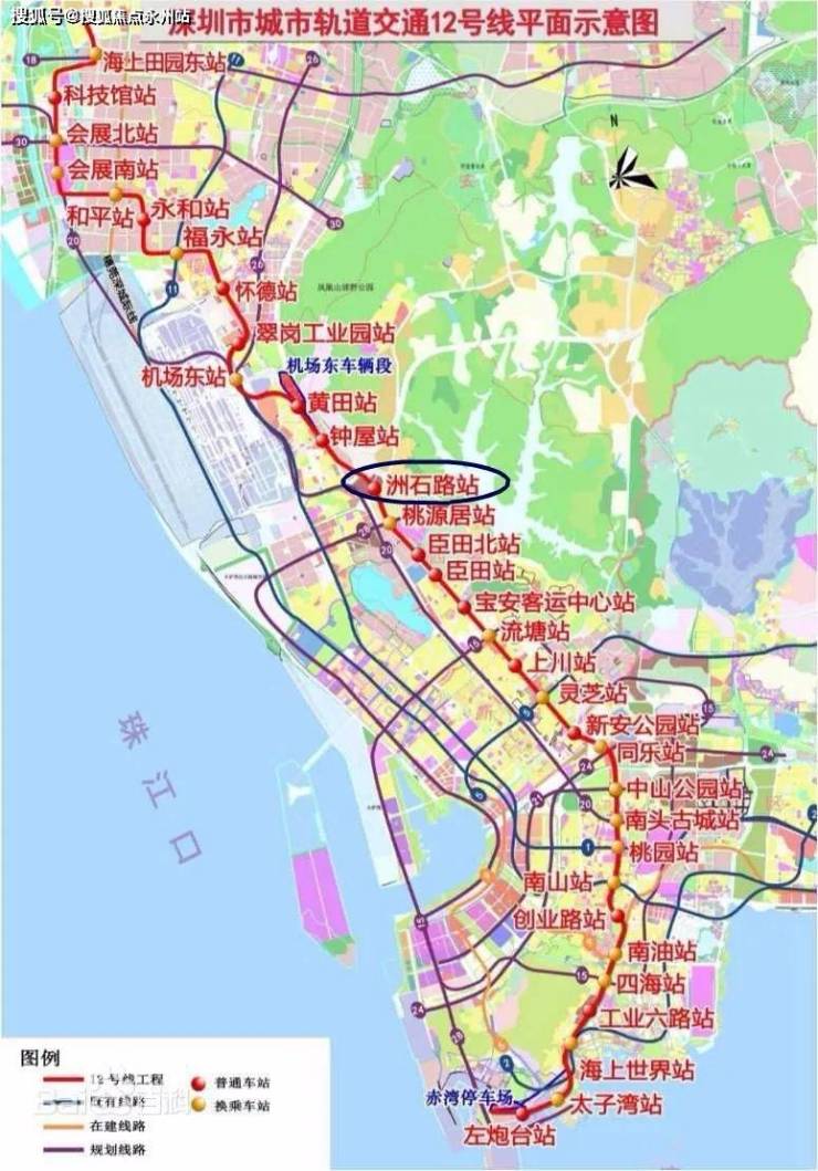 项目1.5公里范围内覆盖有2条地铁线路,一个是已经在运营的1号线(罗宝线),另一个是在建的12号线(南宝线),项目距离12号线桃源居站步行约1.8公里。12号线分两期建设,一期起于南山区左炮台东站,连接蛇口、南山中心区、宝安中心、航空城、大空港等地区,止于宝安区海上田园东站,已于2018年初开工,计划于2022年底开通运营。二期工程起于海上田园东站,终至松岗站,已于2020年底开工,计划2025年开通运营。