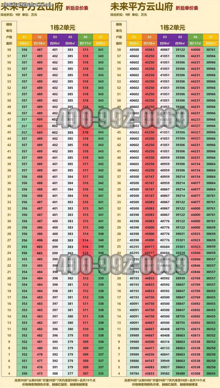 03户型:98平(东南向)单价39600-41100总价389-404万。