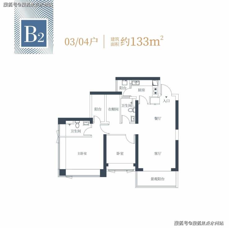 B2户型约133㎡2+1房两卫(1栋2单元03/04户型)经典竖厅格局,餐客一体设计,需要靠封阳台获取+1房,西南朝向,看向在建的赤湾朗玥佳园,能看到伶仃洋海景。