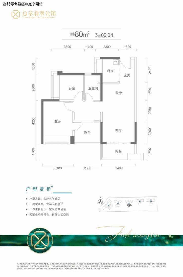 约80㎡三房一卫(03/04户型)三开间朝南,竖厅格局,餐客一体开间3.4米,主卧开间3.1米,卧室1开间2.8米,卧室2开间2.6米,正南朝向。