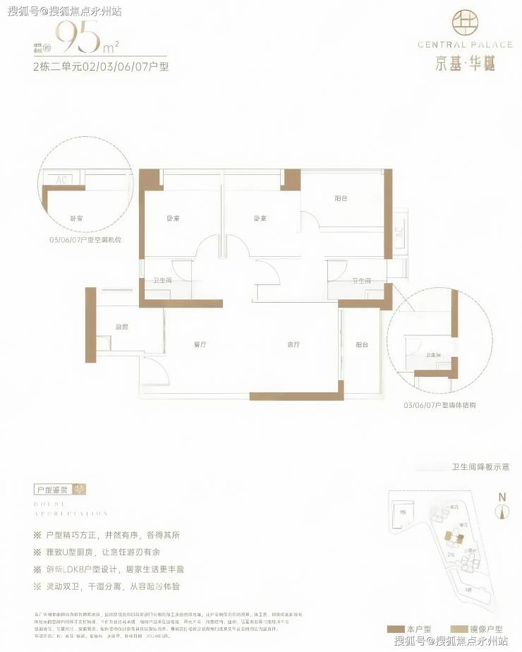 95㎡的3房2厅2卫,设计的是竖厅格局,创新LDKB一体化,L型厨房,卫生间干湿分离,得房率约73%(不含赠送),阳台有东南或西北朝向。