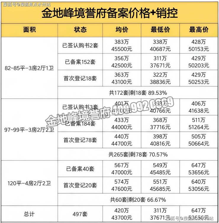 项目于去2024年4月份的时候也是有进行备案价格调整,目前实际的备案均价是4.37万/m²,备案单价3.76-5.36万/m²,总价在311-647万/套。面积有83-85m²的3房2厅1卫,97-98m²的3房2厅2卫,120㎡的4房2厅2卫户型,共497套房源。