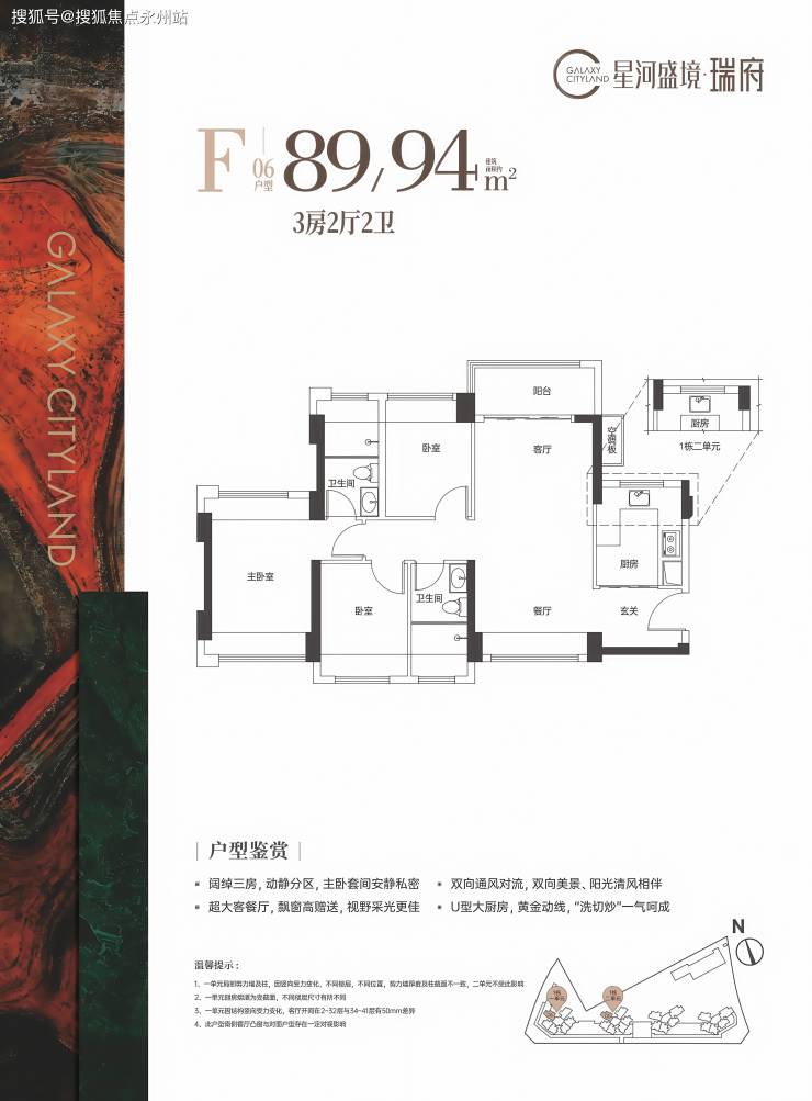 89-94㎡的3房2厅2卫,06户型,设计的是横厅南北通透格局,进门入户玄关,全屋8面飘窗,四开间朝南,主卧南北通套房,3个卧室,得房率约76-81%(不含赠送),阳台主朝东北向。