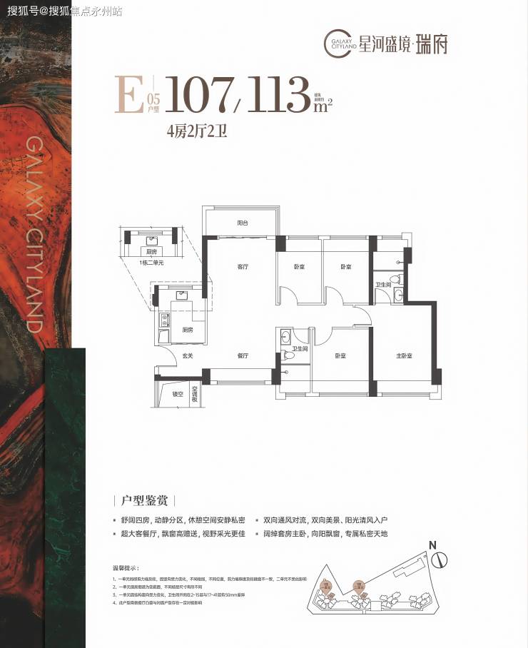 107-113㎡的4房2厅2卫,设计的是竖厅南北通透格局,全屋8面飘窗,四开间朝南,得房率约76-81%(不含赠送),阳台主朝西北向。