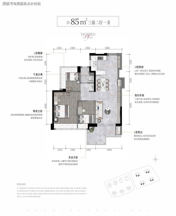建筑面积约85㎡户型:东南活西南朝向,动静分区布局。主要生活空间南向,餐客厨等宽,公共空间联系紧密。客厅带有L型阳台,空间利用灵活,功能全面,可兼顾家政空间。主卧开间进深比良好,空间舒适明亮。双次卧分布均衡,小房间配置L型飘窗,空间利用充分。分离式卫生间,满足高峰期家庭实用需求。入户预留收纳玄关和冰箱位,一体收纳空间。