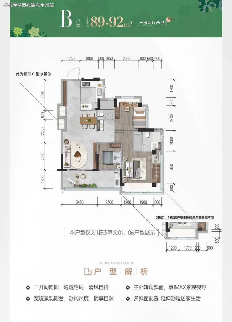 89-92㎡的3房2厅2卫,B户型,设计的是竖厅格局,客厅3.45米开间,LDKB一体化,S墙设计预留冰箱卡槽位,三开间朝南,动静分区,主卧270无边转角飘窗,3个卧室分别做到了主卧18.1㎡/次卧9.44㎡/次卧5.98㎡(包含墙体飘窗),客厅连接次卧出5.75米长的大阳台,U型厨房,公卫三段式分离,得房率约93-99%(包含赠送),西南或东南朝向。