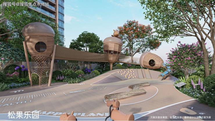 全龄共享运动区:松树下的主题乐园,形成看护与运动一体化的共享模式。