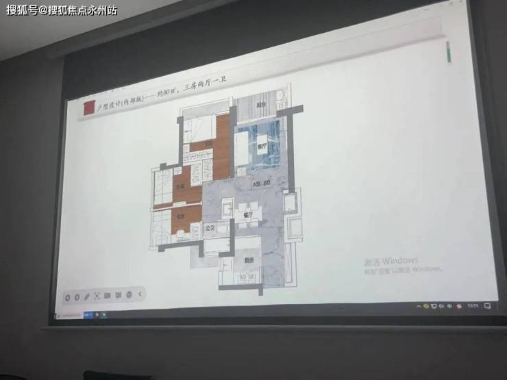 80㎡的3房2厅1卫,设计的是竖厅格局,S墙设计预留冰箱位,U型厨房,卫生间三段式分离设计。