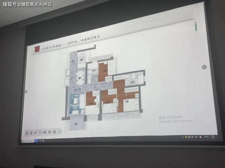 105㎡的4房2厅2卫,设计的是竖厅格局,四开间朝南,S墙设计预留冰箱位,U型厨房,客卫三段式分离设计。