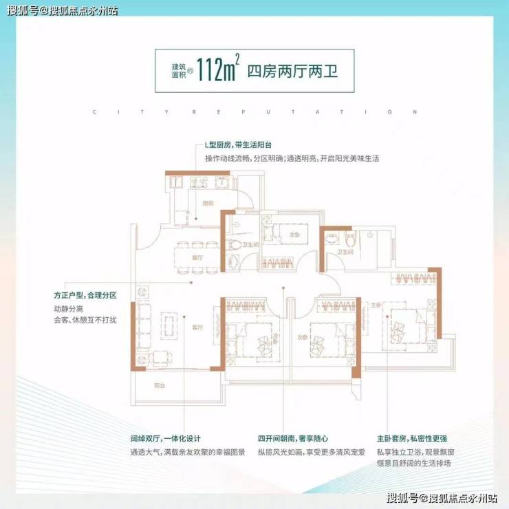 112㎡的4房2厅2卫:设计的竖厅格局,L型厨房,都是东南朝向。