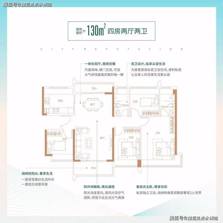 130㎡的4房2厅2卫:设计的竖厅格局,双阳台南北通透,4开间朝南。
