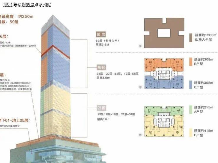 建筑总层数:地下01-地上05层为商业、地上08-59层为品质公寓