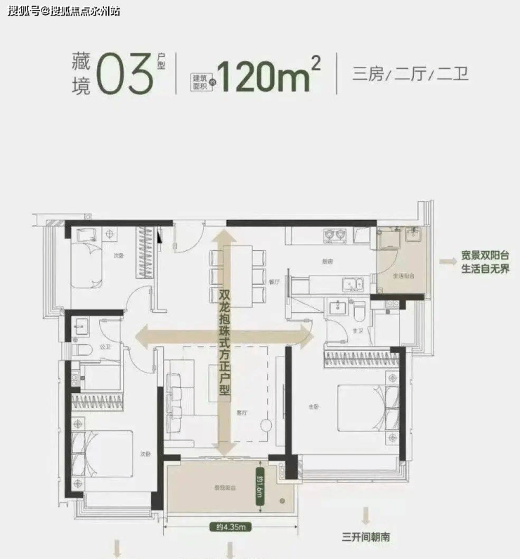 120㎡北侧户型为横厅设计,客厅朝西北向看塘朗山,最大限度享受客餐厅跟山景资源的对话;而南侧户型舒适三房,竖厅设计,双阳台布置,客厅及两卧室朝南无遮挡。