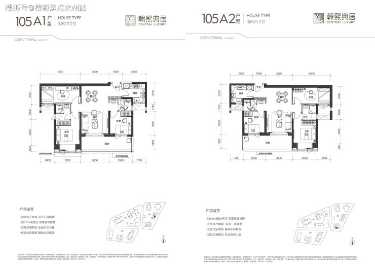 105㎡3房2卫:双龙抱珠格局,朝东/南,阳台开间6.5米,折后总价约894万起(单价8.5万起)。