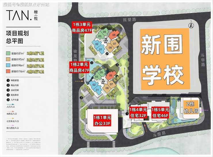 檀悦府,总占地面积约1.6万㎡,总建筑面积约19万㎡,计容建筑面积约14.1万㎡,容积率8.82,绿化率40.12%,共由4栋32-47层高住宅+1栋33层办公组成,其中1栋1单元办公33F,1栋2/3单元商品房47F,1栋4单元住宅32F,1栋5单元住宅46F,2栋配建1所6班制幼儿园。