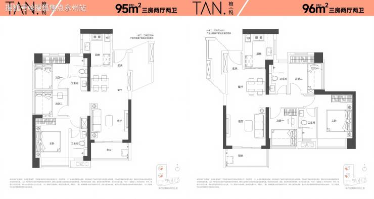 建面约95-96㎡三房两厅两卫(东南/西南朝向):主卧与次卧分列客厅两侧,休息区与活动区互不干扰。