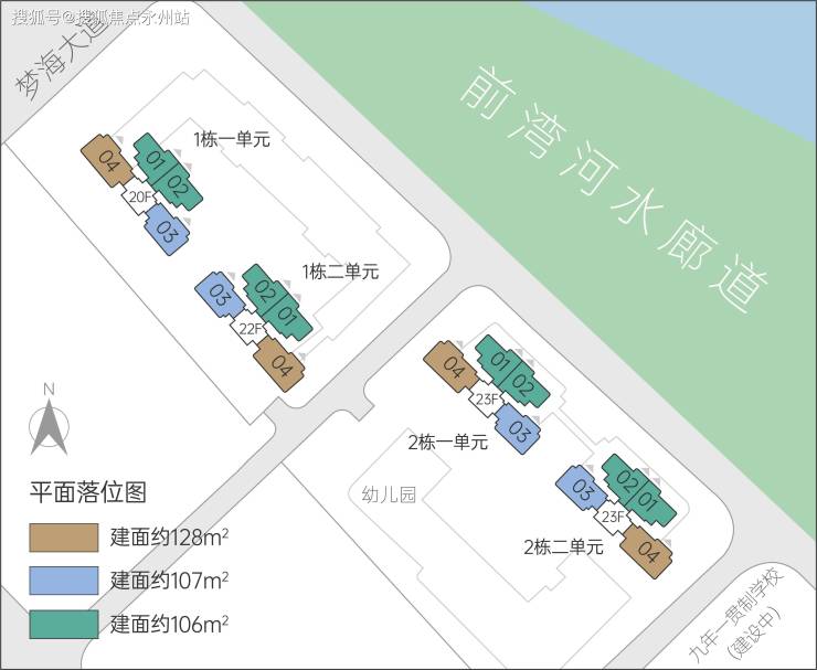 其中建面约106/107㎡3房(约240套)和128㎡4房(约80套),创新实用品质户型,传加上阳台半赠送飘窗全赠送拓展使用率高达约90%,3.27容积率,23层水岸住宅