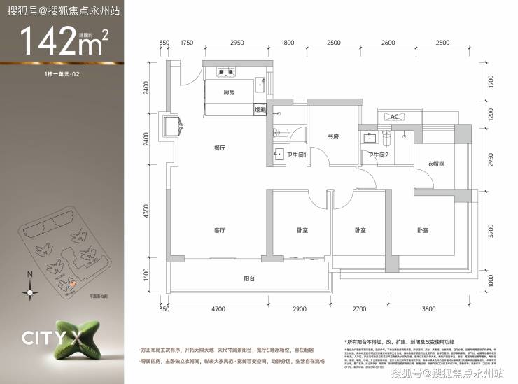 142㎡四房两厅两卫是项目的终极改善产品,仅52套,占比不足4%。该户型客厅4.7米开间,主卧24.03㎡(含衣帽间),赠送12.16㎡观景阳台,实得面积121.81㎡。11月加推的1栋1单元中,该户型折后总价624-648万,东南向直面社区中央园林,预计租金回报率3.5%,高于区域平均水平。