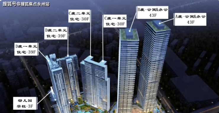 晗山悦海规划由6座主体建筑+1座幼儿园+1座商业裙楼组成。其中A座和B座是43层的商办建筑,C座一单元、C座二单元、D座一单元、D座二单元是30-39层的住宅建筑,幼儿园位于项目地地块北侧,是一个独立地块,商品裙房位于小区西南角,由连廊与住宅底商连接。