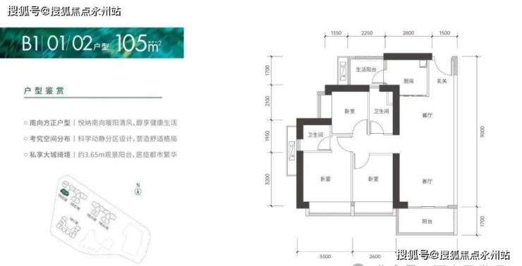 95㎡的3房2厅2卫,仅1栋B2座01户型,设计的是竖厅格局,客厅3.35米开间,进门入户玄关,LDKB一体化设计,3个卧室分别做到了2.95米/2.6米/2.25米的宽度,L型厨房还带1个小生活阳台,卫生间干湿分离,得房率:75.66%(不含赠送),阳台朝西南向。