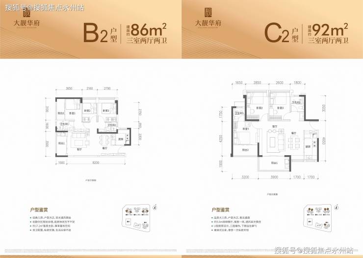 86㎡:三开间朝南,双卫设计,总价约 365 万起,性价比突出。