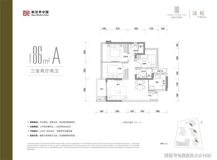 86㎡三房两卫:刚改主力户型,双卫设计提升居住私密性,规避早高峰卫浴争抢问题,南向采光面充足,阳台、飘窗附赠空间,兼顾舒适度与实用性。