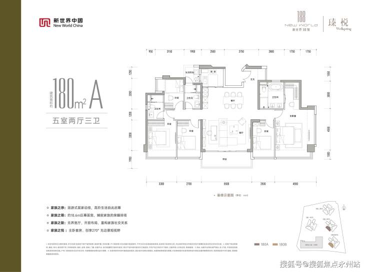 180㎡五房三卫大平层:高端改善产品,宽厅阔景布局,多功能房间灵活改造,兼具居住质感与圈层属性,满足高阶人居追求。所有户型摒弃奇葩拐角设计。