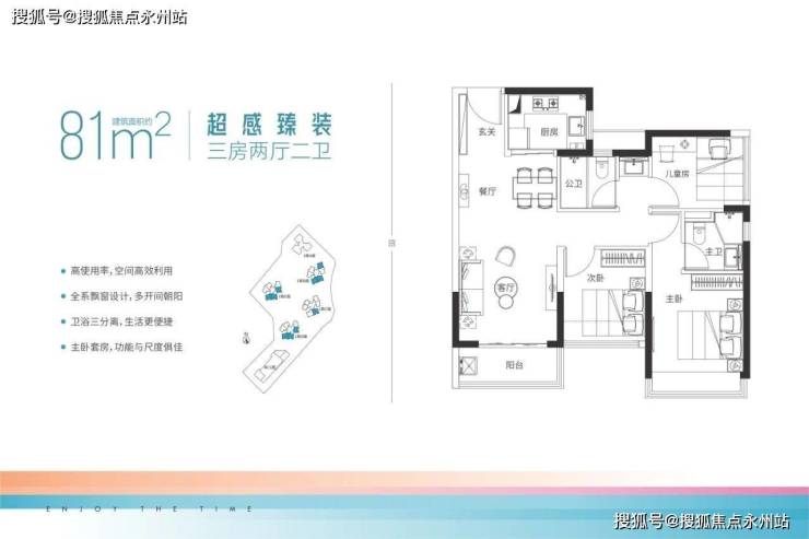 约81㎡三房两卫(1栋B座01/02/05户型、1栋C座01户型、1栋D/E座01/02/06户型)竖厅格局,餐客一体,动静分区结构,客厅开间约3.2米,主卧开间约3米,两个次卧开间约2.7米,约2.3米,阳台有东南、东北和南朝向。