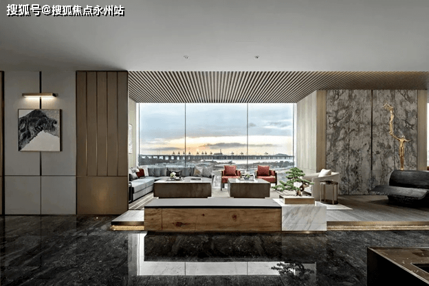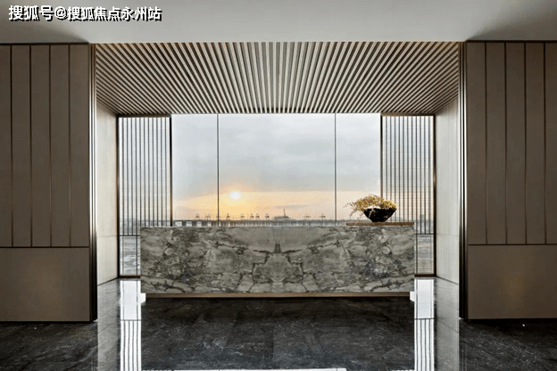 胤璞公寓的车库大堂也打造得大气豪华。车库大堂设置了沙发休息区,并在旁边打造日式枯山水景观,营造充满宁静禅意的意境,打造出归家的仪式感以及私密感,希望业主回到家的那一刻回归内心的宁静感与“慢下来”的生活方式。