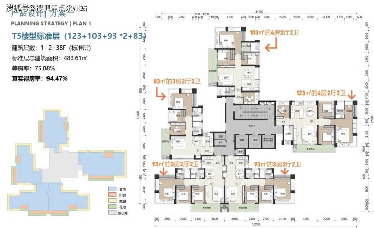 项目主打刚需及改善型户型,涵盖83-123㎡三至四房,全部为2卫设计,得房率优势显著(含赠送面积)