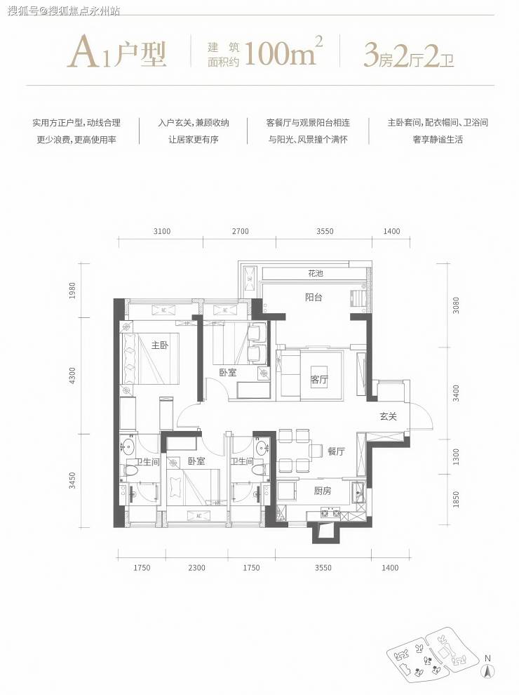 100㎡的3房2厅2卫,A1户型,设计的是竖厅格局,客厅3.55米开间,进门玄关,LDKB一体化设计,动静分区,L型厨房,卫生间干湿分离,阳台主朝西北向。
