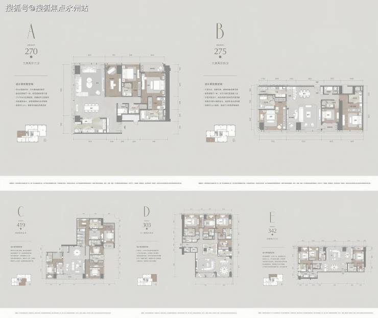 大平层公寓:270㎡3房3卫,275㎡3房4卫,303㎡4+1房4卫,342㎡4房3卫,419㎡4房5卫