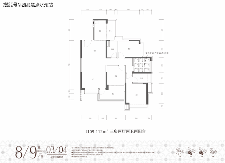 约109-112㎡三房两卫(8/9栋03/04户型)经典竖厅格局,餐客一体设计,带独立生活阳台,奇数层客厅正出景观阳台,偶数层客厅侧出景观阳台,西南朝向