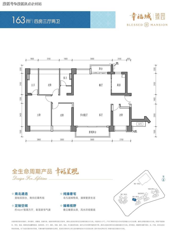 163㎡四房(方厅):设计的是横厅南北通透格局,进门入户玄关,客厅5.9米开间,餐厨一体化设计,南北双阳台,全屋7个飘窗面,4个卧室,客厅出8.85㎡的观景大阳台,U型厨房,公卫三段式分离。