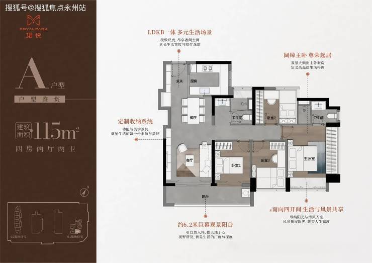 115㎡的4房2厅2卫,A户型(1栋1单元05户型),设计的是经典竖厅格局,进门入户玄关,LDKB一体化,S墙设计预留冰箱卡槽位,四开间朝南,动静分区,主卧双面飘窗,客厅连接次卧出6.2米长的巨幕大阳台,U型厨房,公卫三段式分离,东南朝向,靓点是2个最小的次卧都不用睡飘窗。