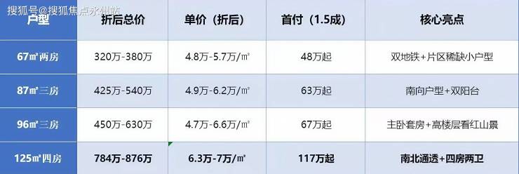 首期备案均价为6.36万元/㎡,较早期宣传的7.2万元/㎡有所下调。根据实际销售情况,折后均价约为5.5万元/㎡,折扣力度达约13.5%。具体到不同单元,价格差异明显: