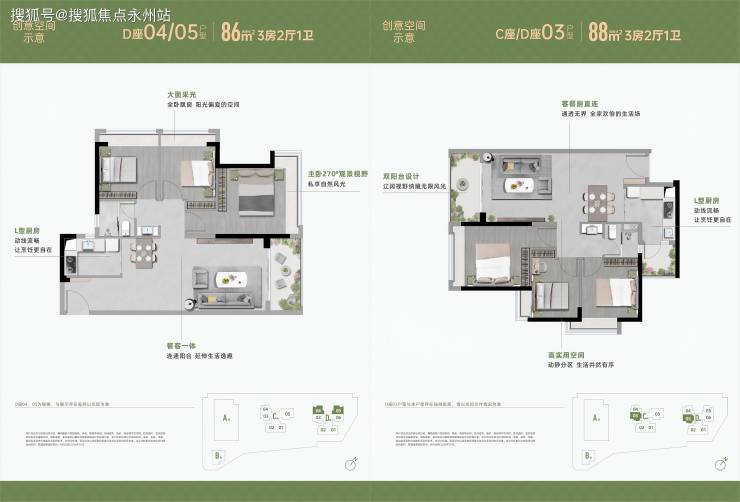 86㎡:东北或西南朝向,次卧 8.34-8.97㎡,L 型厨房。
